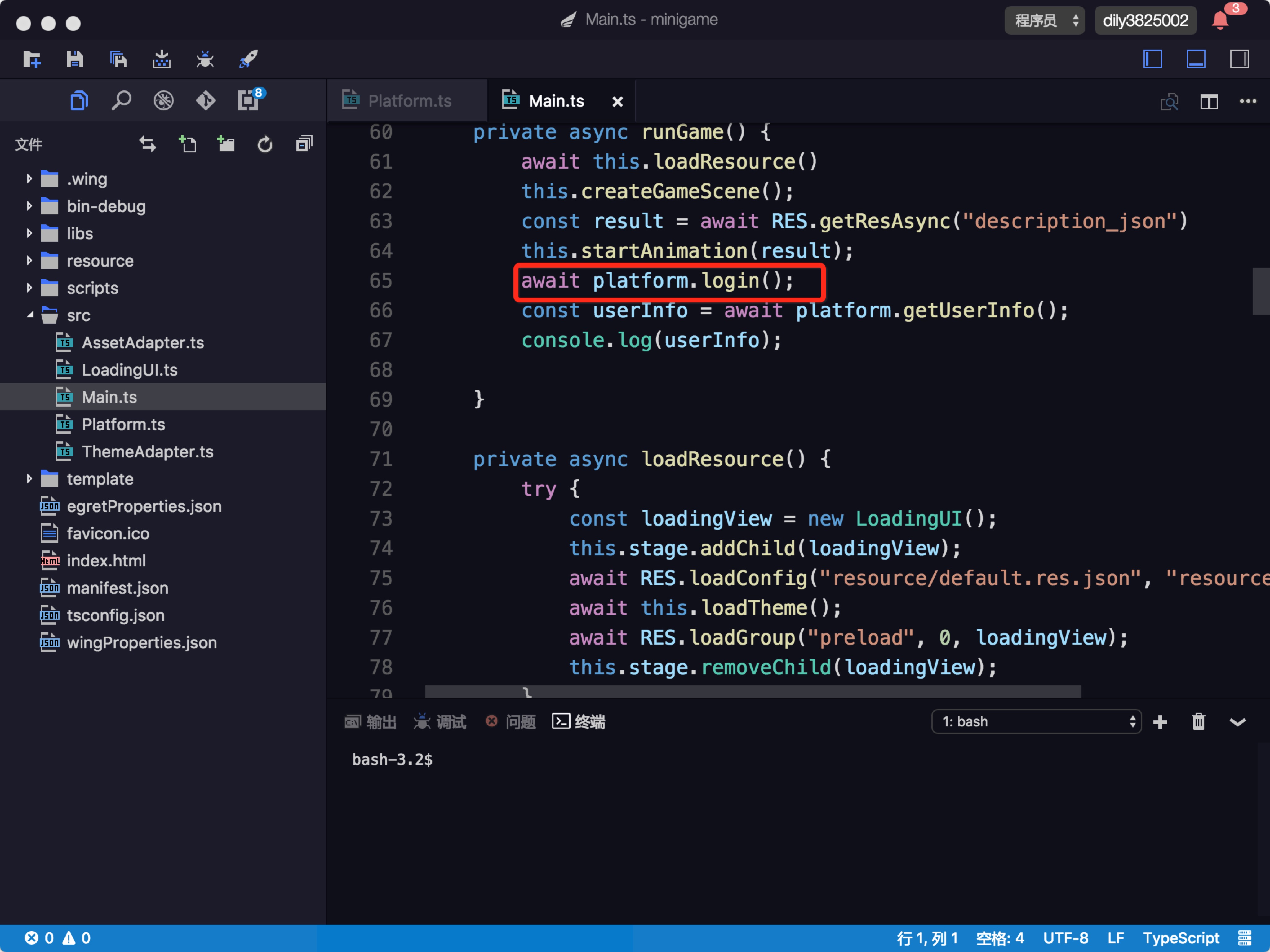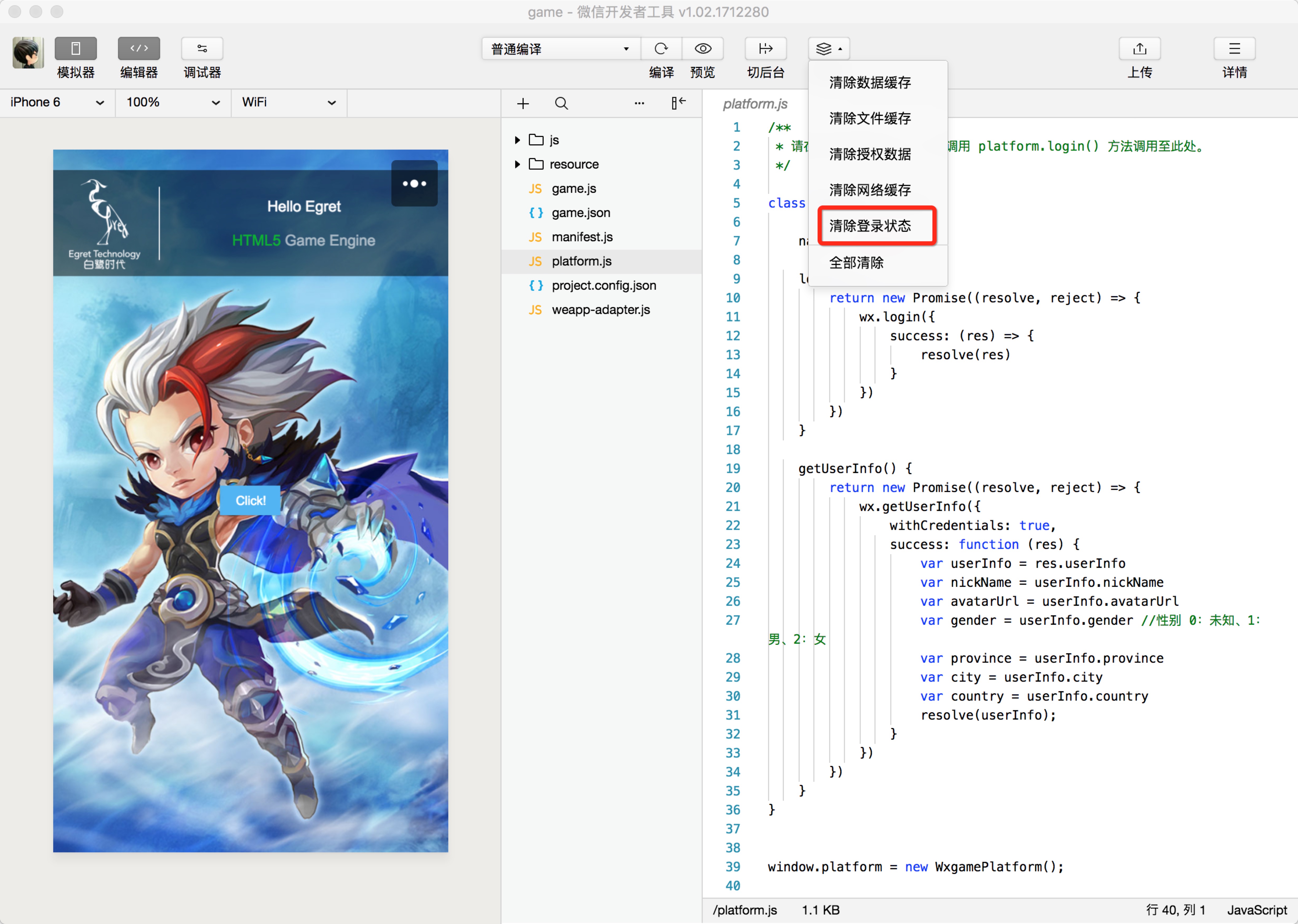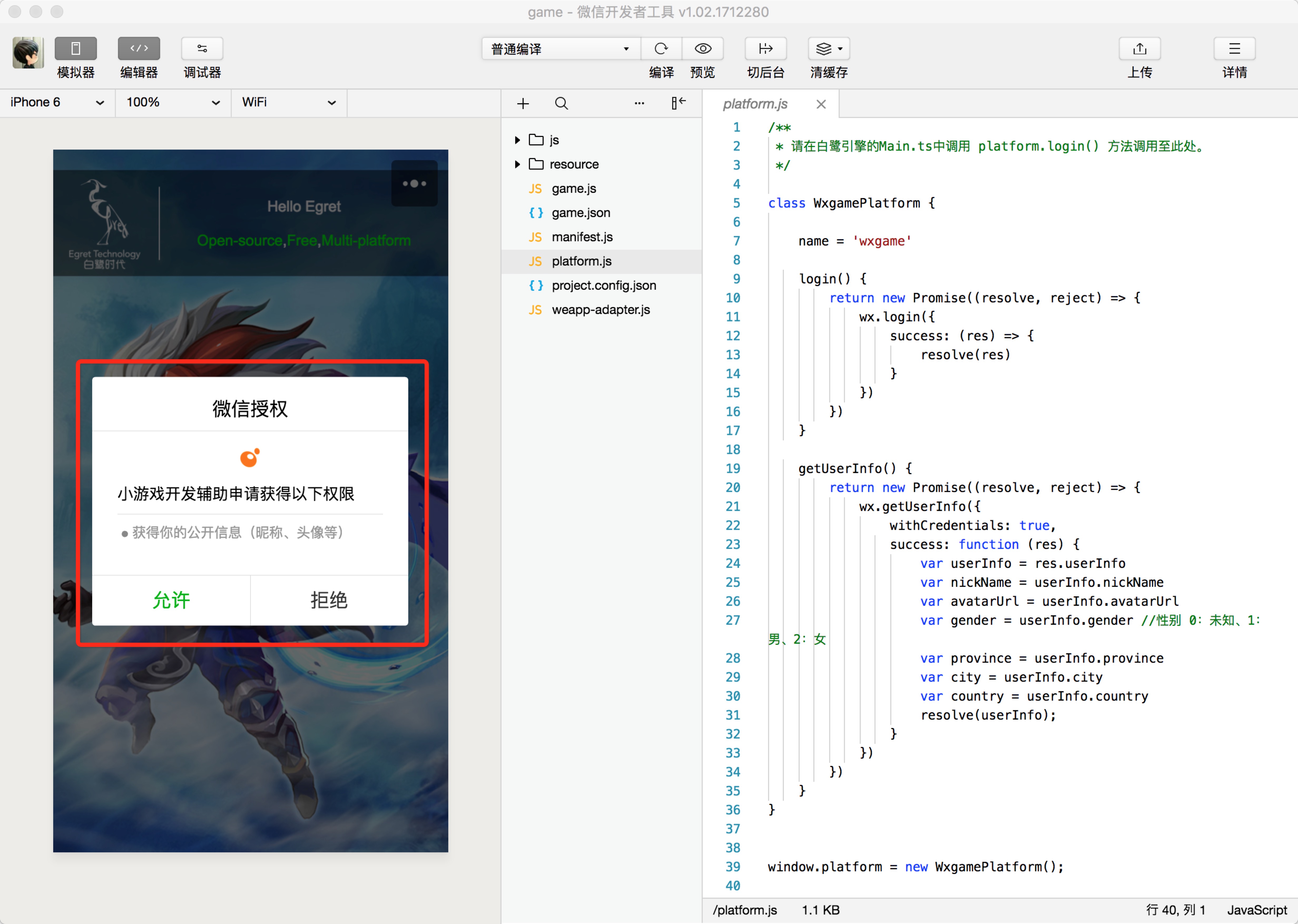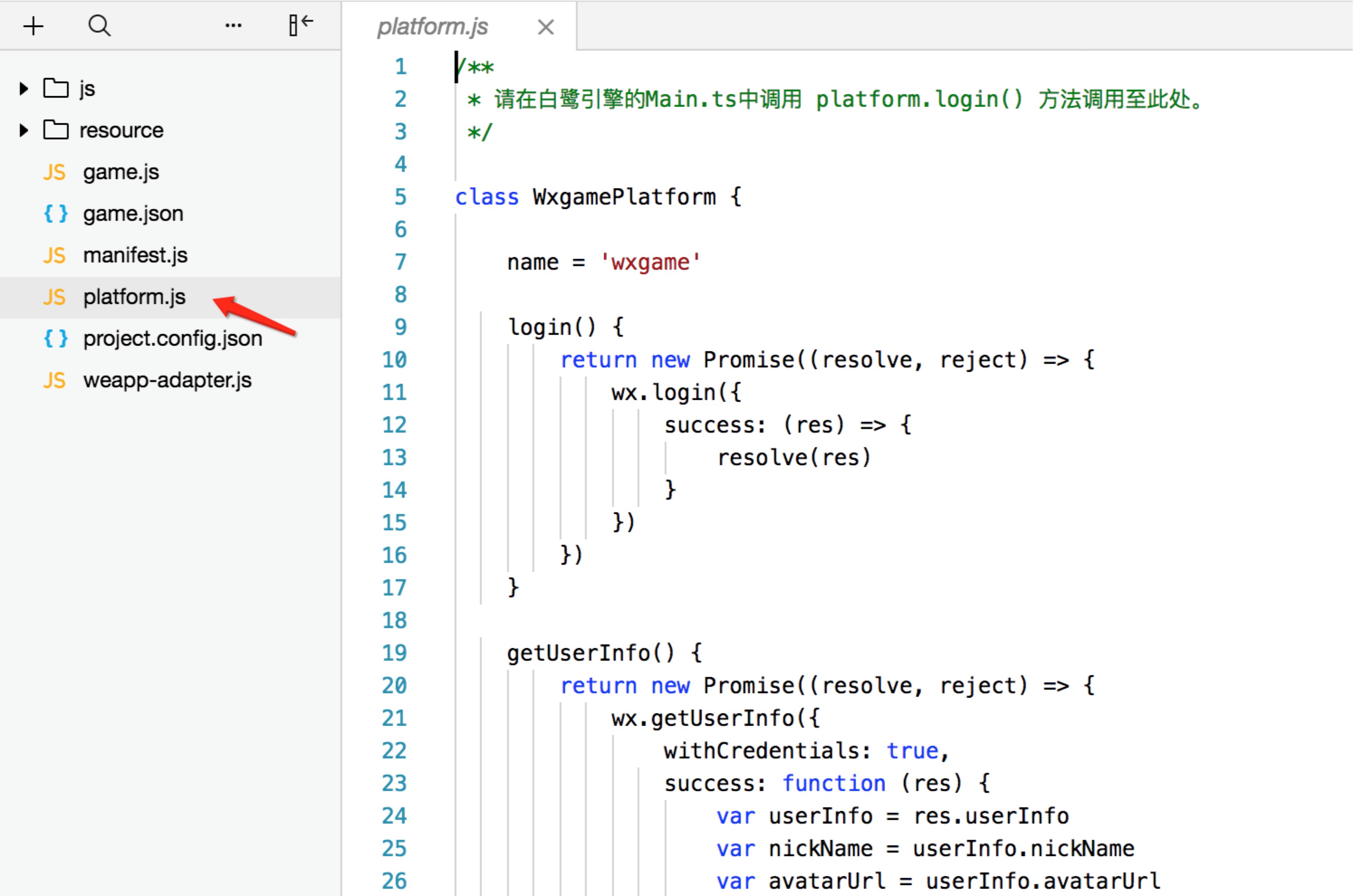 上述代码使用了小游戏的登陆 API,只需要在 Egret 项目中调用 platform.login() 方法即可。