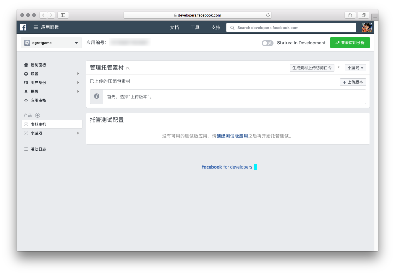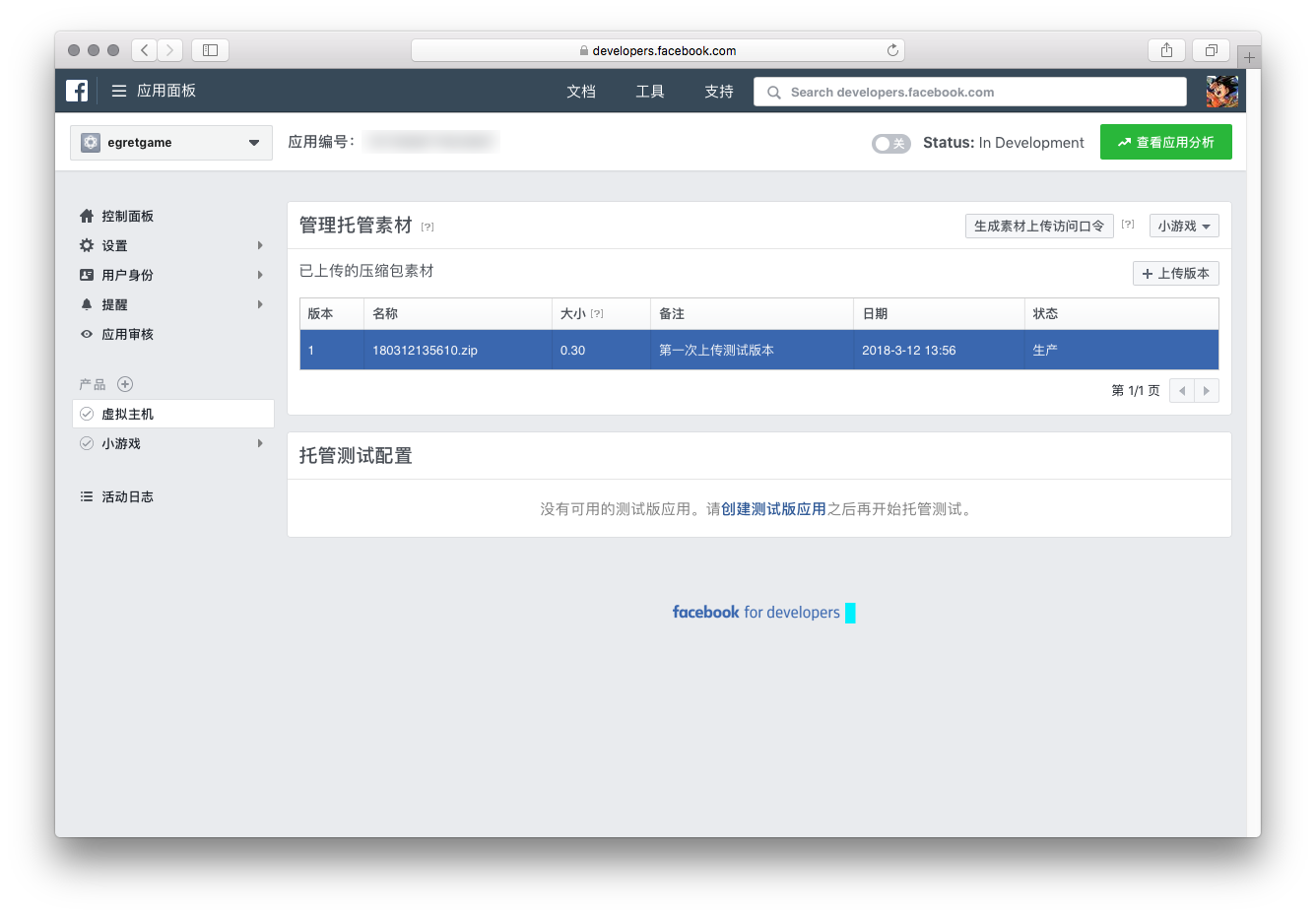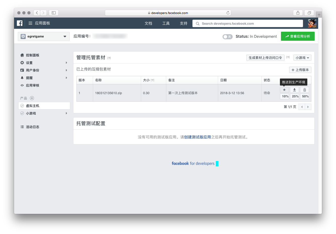 点击上传即可将当前项目打包并推送到Facebook服务器中。