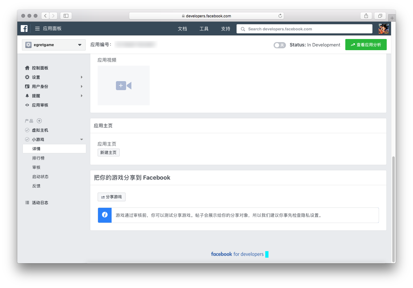 在Facebook Instant Games中,点击详情,最下方的分享游戏,将当前游戏分享至您的Facebook信息流中。