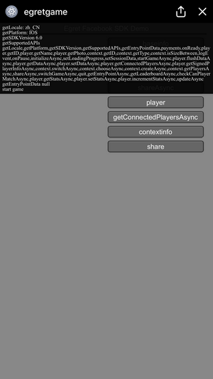class Main extends egret.DisplayObjectContainer {public static menu: any;private static _that: egret.DisplayObjectContainer;public constructor() {super();this.once(egret.Event.ADDED_TO_STAGE, this.addStage, this);}private addStage(evt: egret.Event): void {this.initializeAsync();FBInstant.startGameAsync().then(() => {egret.log("start game");Main._that = this;Context.init(this.stage);Main.menu = new Menu("Egret Facebook SDK Demo");this.addChild(Main.menu);this.createMenu();});}public static backMenu(): void {Main._that.removeChildren();Main._that.addChild(Main.menu);}private createMenu(): void {Main.menu.addTestFunc("baseinfo", this.baseinfo, this);Main.menu.addTestFunc("quit", this.quit, this);Main.menu.addTestFunc("logEvent", this.logEvent, this);Main.menu.addTestFunc("shareAsync", this.shareAsync, this);Main.menu.addTestFunc("player", this.player, this);Main.menu.addTestFunc("getConnectedPlayersAsync", this.getEgretConnectedPlayersAsync, this);Main.menu.addTestFunc("contextinfo", this.contextinfo, this);Main.menu.addTestFunc("share", this.share, this);}private initializeAsync(): void {FBInstant.initializeAsync().then(function () {egret.log("getLocale:", FBInstant.getLocale());egret.log("getPlatform:", FBInstant.getPlatform());egret.log("getSDKVersion", FBInstant.getSDKVersion());egret.log("getSupportedAPIs", FBInstant.getSupportedAPIs());egret.log("getEntryPointData", FBInstant.getEntryPointData());});setTimeout(function () {FBInstant.setLoadingProgress(100);}, 1000);}private baseinfo() {egret.log("baseinfo");egret.log("getLocale:", FBInstant.getLocale());egret.log("getPlatform:", FBInstant.getPlatform());egret.log("getSDKVersion", FBInstant.getSDKVersion());egret.log("getSupportedAPIs", FBInstant.getSupportedAPIs());egret.log("getEntryPointData", FBInstant.getEntryPointData());}private quit(): void {egret.log("quit");FBInstant.quit();}private logEvent(): void {egret.log("logEvent");FBInstant.logEvent("test", 2, { "test": "ta" });}private shareAsync(): void {egret.log("shareAsync");let data: FBInstant.SharePayload = {intent: "",text: "",image: "",};FBInstant.shareAsync(data);}private player() {egret.log("player");egret.log("player.getID", FBInstant.player.getID());egret.log("player.getName", FBInstant.player.getName());egret.log("player.getPhoto", FBInstant.player.getPhoto());}private async getEgretConnectedPlayersAsync() {egret.log("frends info:::");let datas: FBInstant.ConnectedPlayer[] = await FBInstant.player.getConnectedPlayersAsync();egret.log(datas);datas.forEach(element => {egret.log("player.getID", element.getID());egret.log("player.getName", element.getName());egret.log("player.getPhoto", element.getPhoto());});}private contextinfo(): void {egret.log("Context.getID", FBInstant.context.getID());egret.log("Context.getType", FBInstant.context.getType());}private share(): void {egret.log("share");let data: FBInstant.SharePayload = {intent: "",text: "",image: "",};FBInstant.shareAsync(data);}}