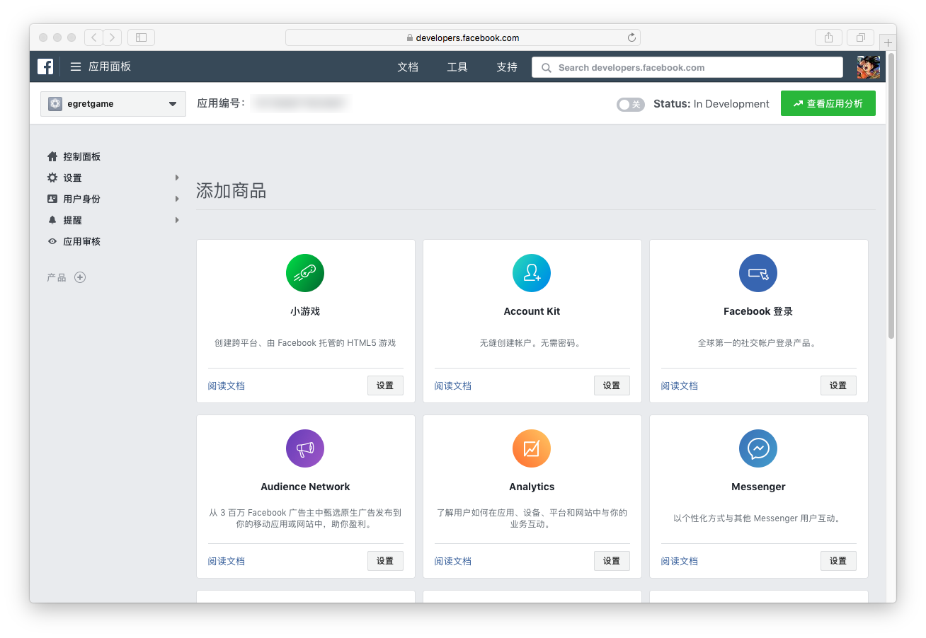 进入到新创建的项目详情面板中,在添加商品中,选择Facebook Instant Games,如图: