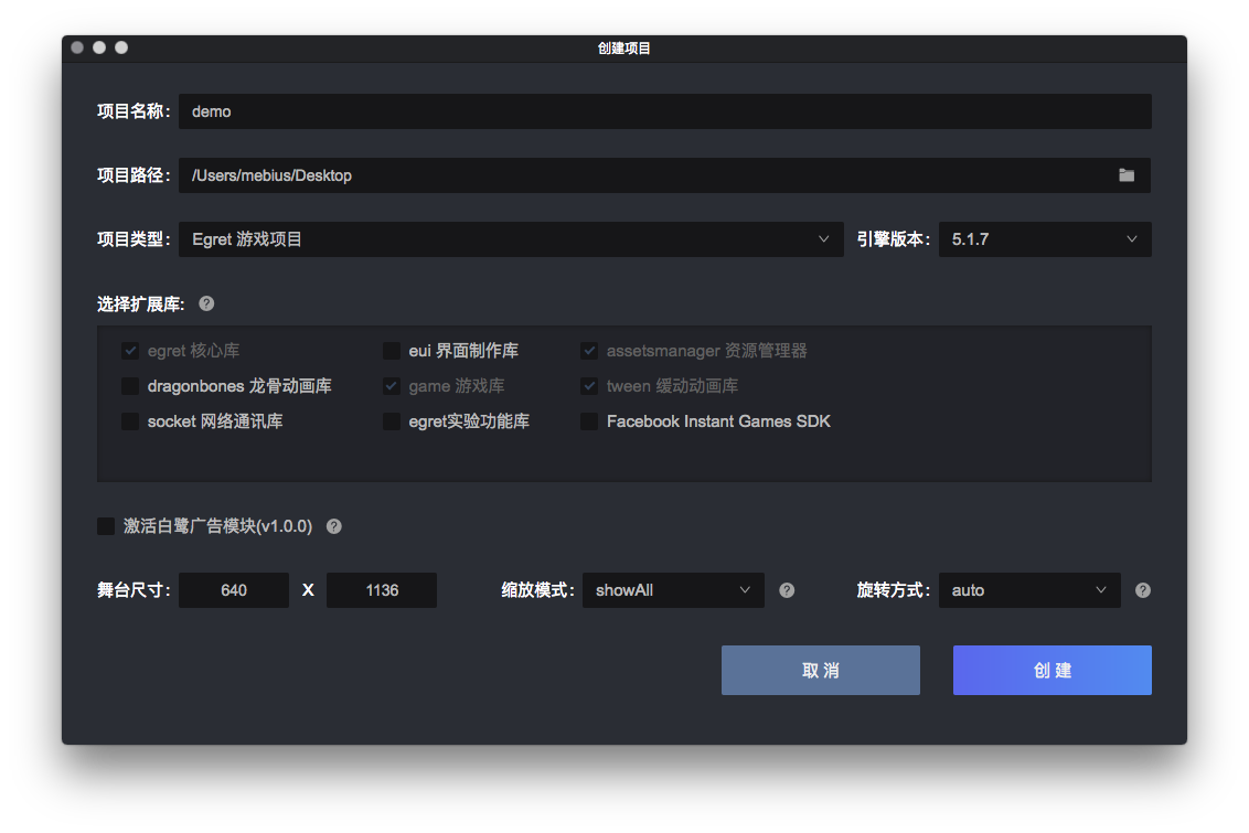 创建Egret项目,扩展库中需要选择Facebook Instant Games