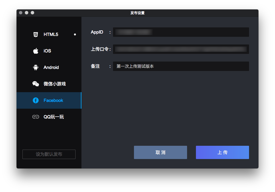 选择Facebook选项卡,填写您的APP ID和刚刚生成的上传口令,在备注中,填写此次上传版本的描述信息。