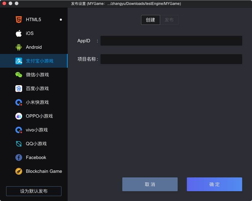 支付宝小游戏标签,点击确定,创建项目