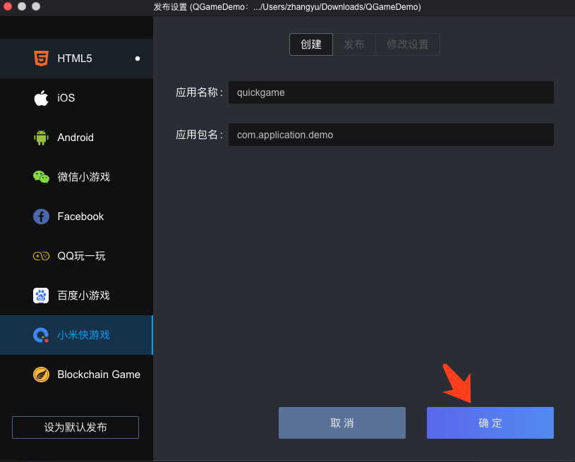 小米快游戏标签,点击确定,创建项目。注意:应用名称和包名,必须使用在快游戏官网注册好的,否则无法调试