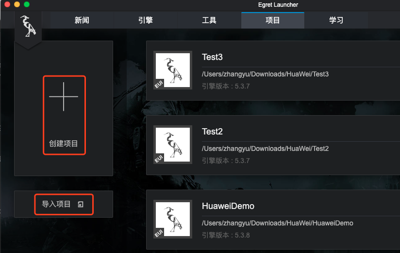 使用最新版的 Egret Launcher 创建一个 Egret 游戏项目,或者将原有的 Egret 项目导入