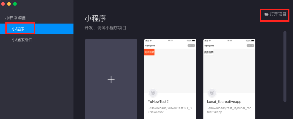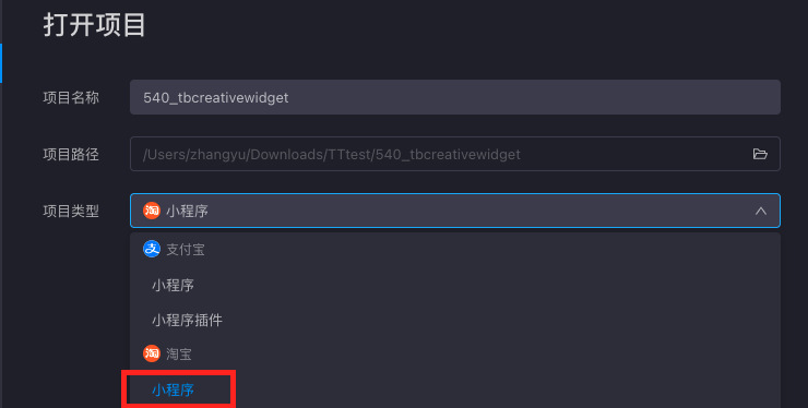 - 点击【小程序】->【打开项目】,选择刚才创建好的淘宝创意互动小程序项目