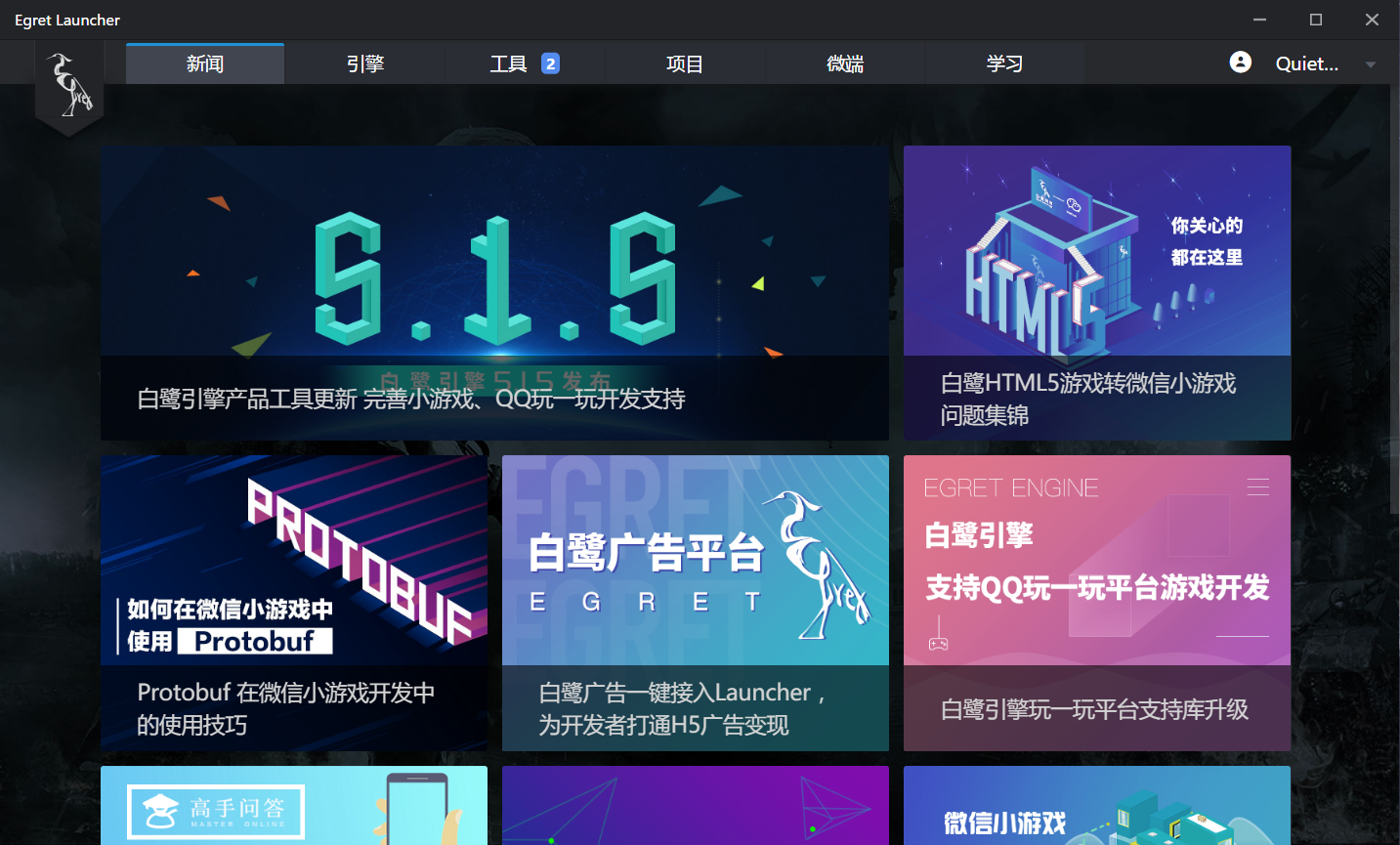 登陆成功后会显示 Egret Launcher 主界面。