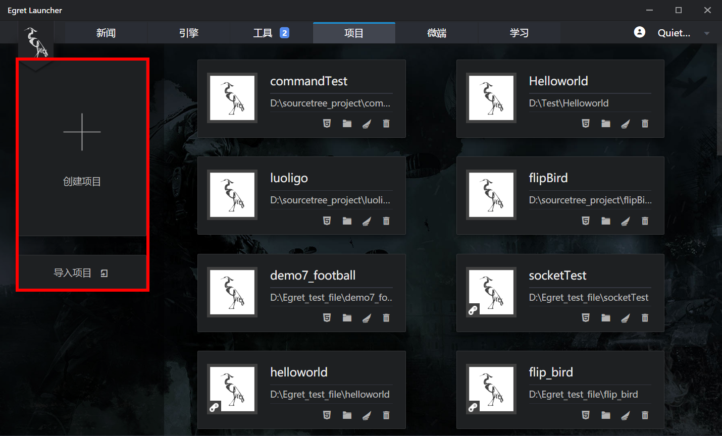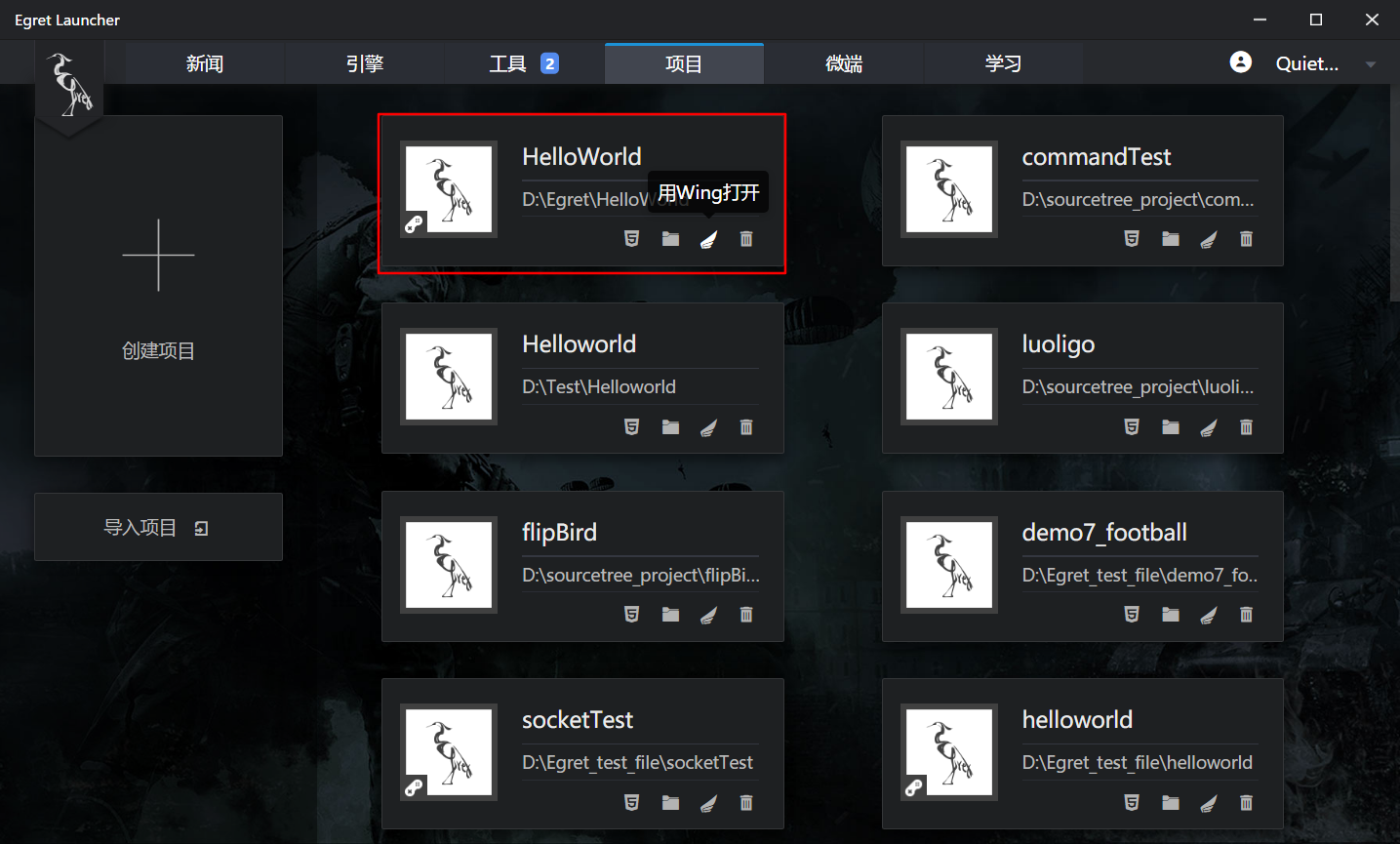 项目可以直接在Egret Launcher 中进行打开,管理。