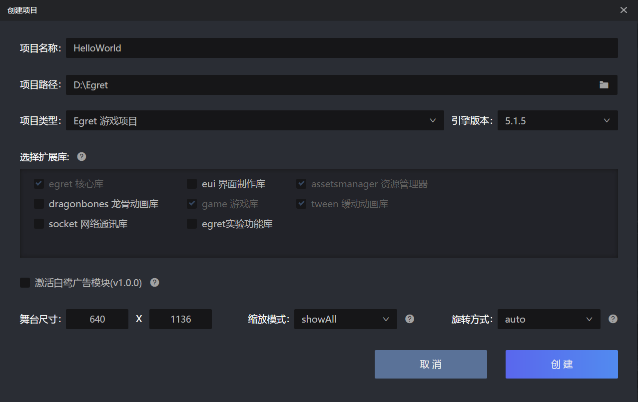 项目类型 该项目的项目类型,如 Egret 游戏项目 , Egret EUI 项目。