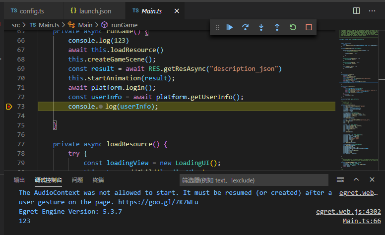 运行面板选择Egret WebpackDevServer Debugger,按F5进行调试。支持在 VSCode 中进行断点调试,同时浏览器控制台输出的信息会同步显示在调试控制台中。