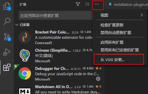 视图和更多操作按钮,选择从VSIX安装,选择本地的插件安装包进行安装