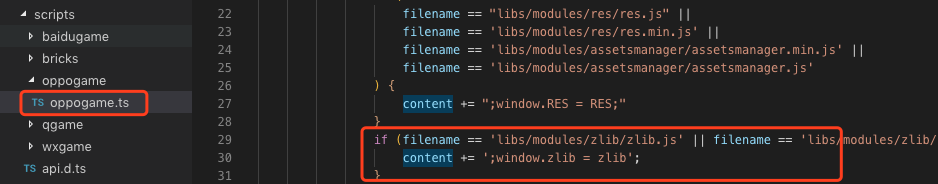 经检查适合小游戏的标准,但还是会报我们使用的 第三放库未定义,需要我们把第三方库挂在到全局对象 window 上,我们可以在 mygame.ts 的文件中添加。例如我们加入 zlib 库。如图: