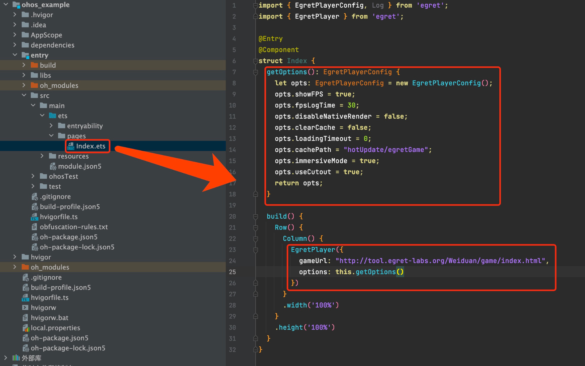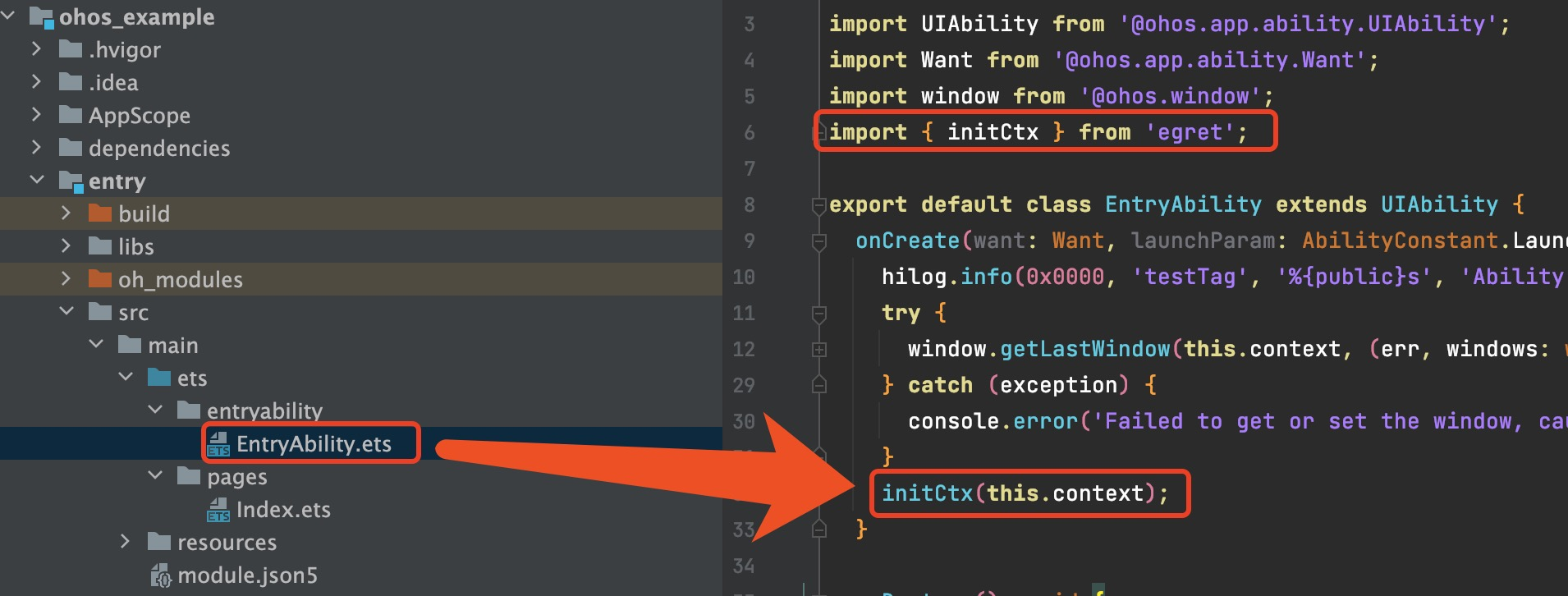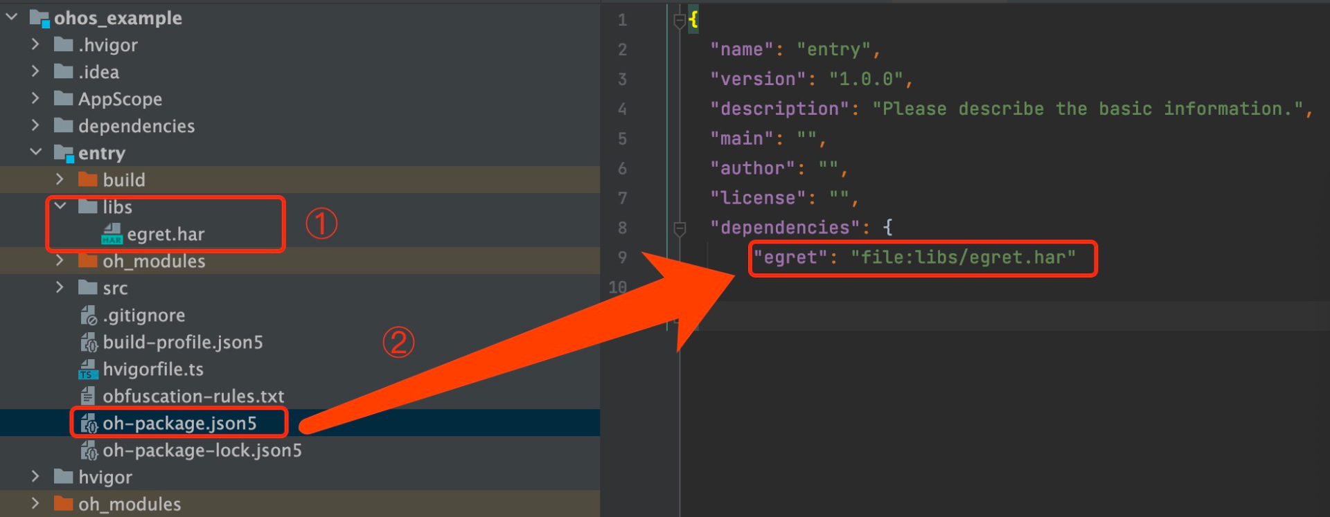 - 拷贝egret.har库文件到鸿蒙项目主模块libs目录下,并在模块配置文件添加引用