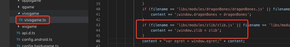 经检查适合小游戏的标准,但还是会报我们使用的 第三放库未定义,需要我们把第三方库挂在到全局对象 window 上,我们可以在 qqgame.ts 的文件中添加。例如我们加入 zlib 库。如图: