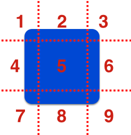 上图中,用四条虚线将圆角矩形分割为9个区域,其中四个区域(图中区域编号1,3,7,9)包含了圆角矩形的四个圆角。拉伸图像时,1,3,7,9区域不拉伸,2,8区域仅横向拉伸,4,6区域仅纵向拉伸,5区域横向纵向都拉伸。