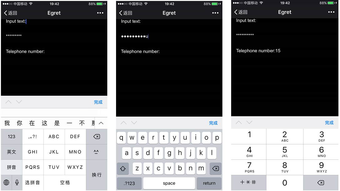 const text: egret.TextField = new egret.TextField();text.type = egret.TextFieldType.INPUT;//设置输入文本的样式为文本text.inputType = egret.TextFieldInputType.TEXT;text.text = "Input text:";text.width = 300;this.addChild(text);const pass: egret.TextField = new egret.TextField();pass.type = egret.TextFieldType.INPUT;//设置输入文本显示为密码pass.inputType = egret.TextFieldInputType.PASSWORD;//设置密码显示pass.displayAsPassword = true;pass.text = "Password";pass.y = 100;pass.width = 300;this.addChild(pass);const tel: egret.TextField = new egret.TextField();tel.type = egret.TextFieldType.INPUT;//设置输入电话号样式tel.inputType = egret.TextFieldInputType.TEL;tel.text = "Telephone number:";tel.y = 200;tel.width = 300;this.addChild(tel);