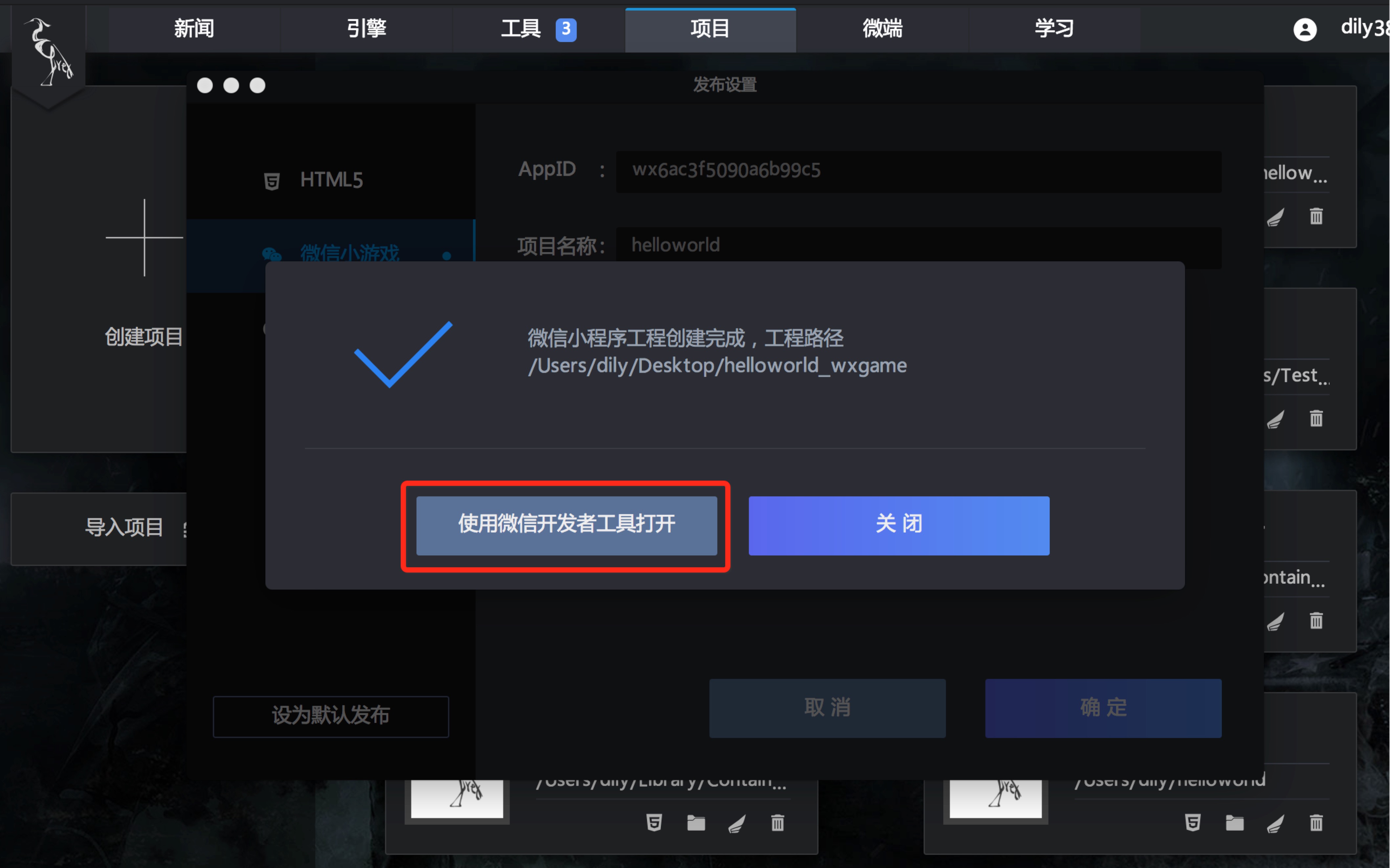 点击确定按钮后,弹出提示面板(注:只有 Egret Launcher 1.0.37 以上版本会显示“使用微信开发者工具打开”按钮):