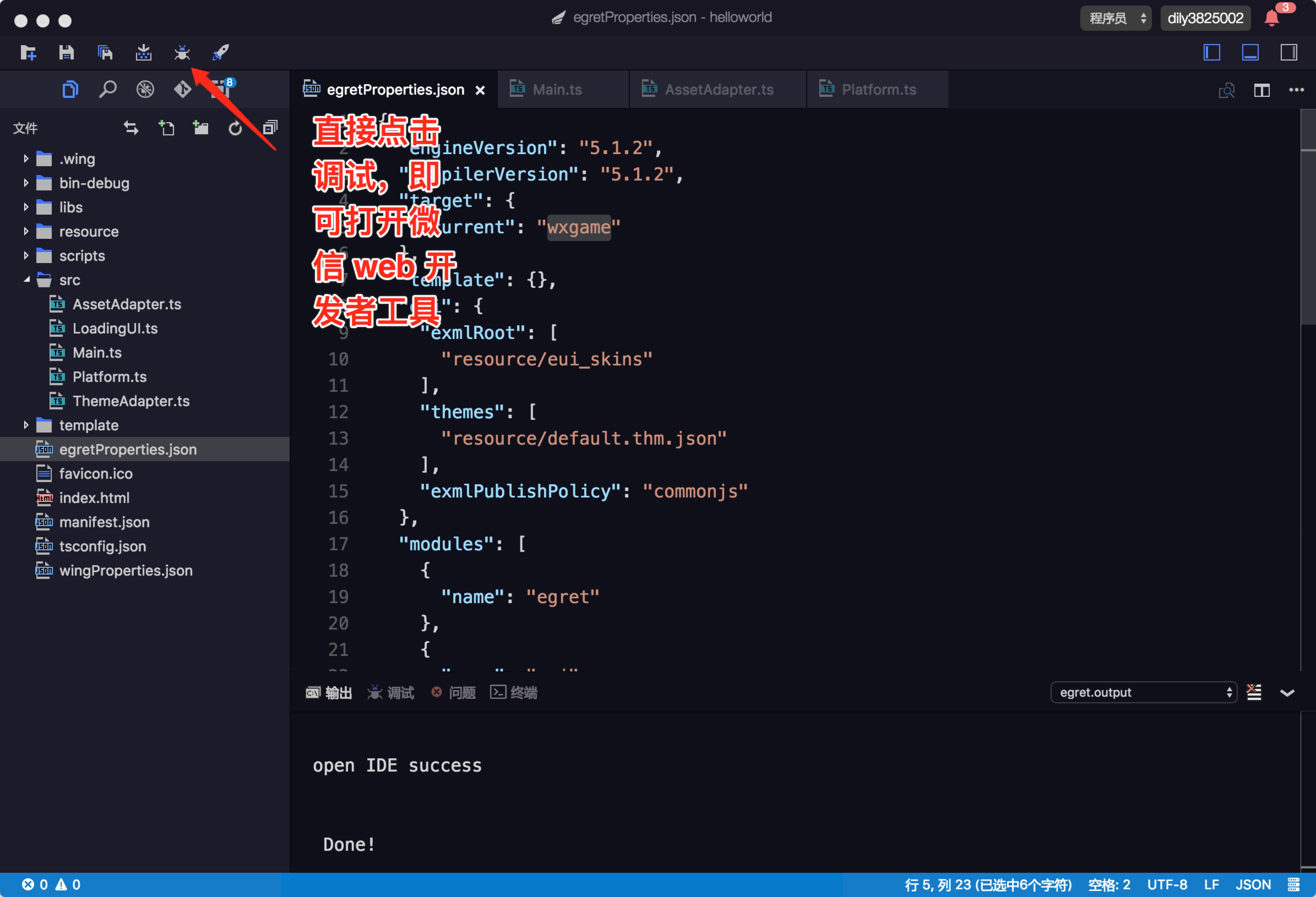 在 wing 编辑器中,修改 egretProperties.json 配置文件中的 target 对象的 current 属性为 wxgame,然后点击调试按钮,会自动打开 微信开发者工具。