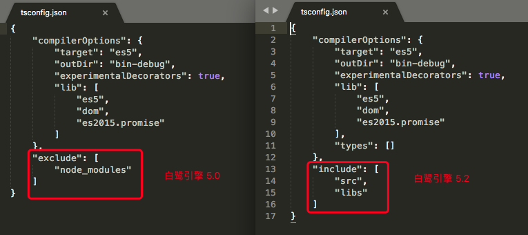 如上图所示,白鹭引擎 5.0 系列和 5.2 系列的 tsconfig.json 配置有所不同。