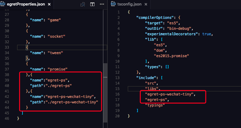 上图为我们一个游戏项目的配置示例,该项目使用了 egret-ps 和 egret-ps-wechat-tiny 两个库。